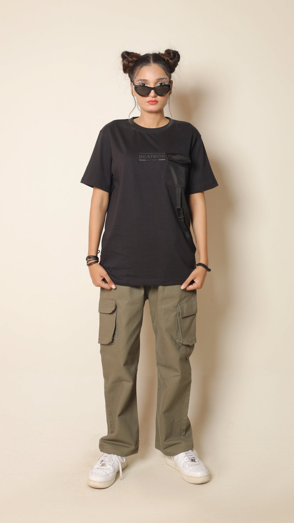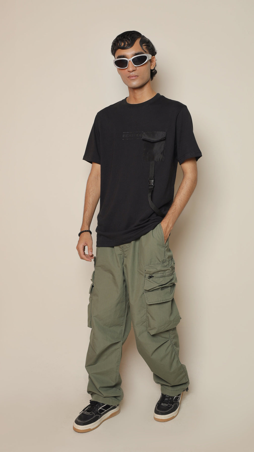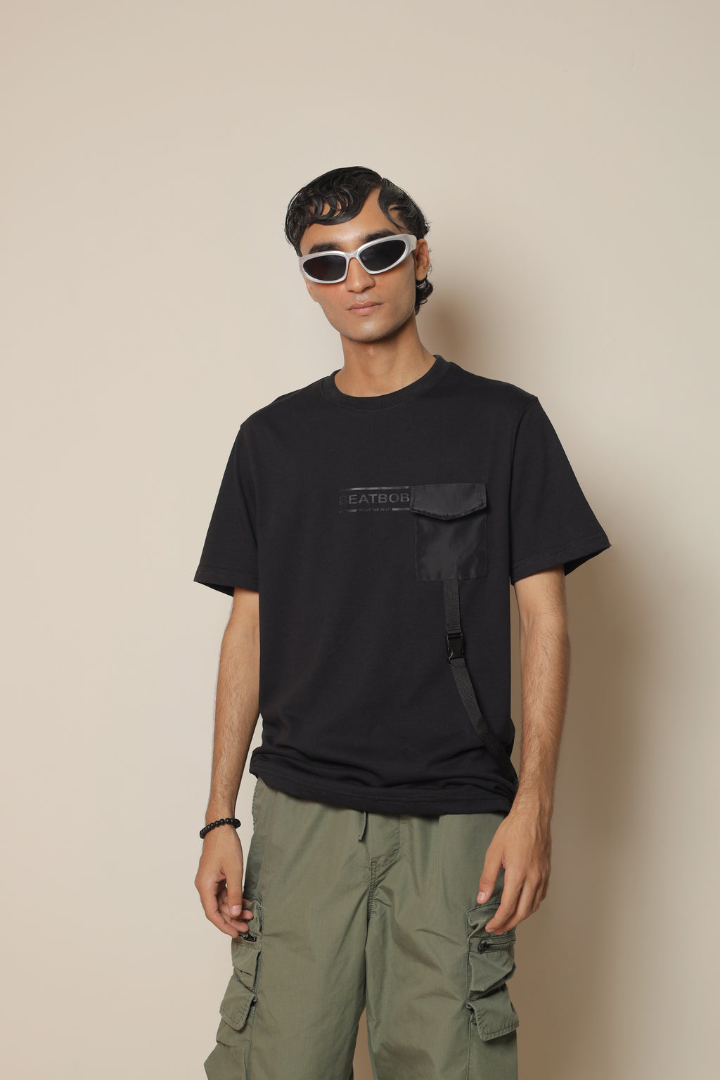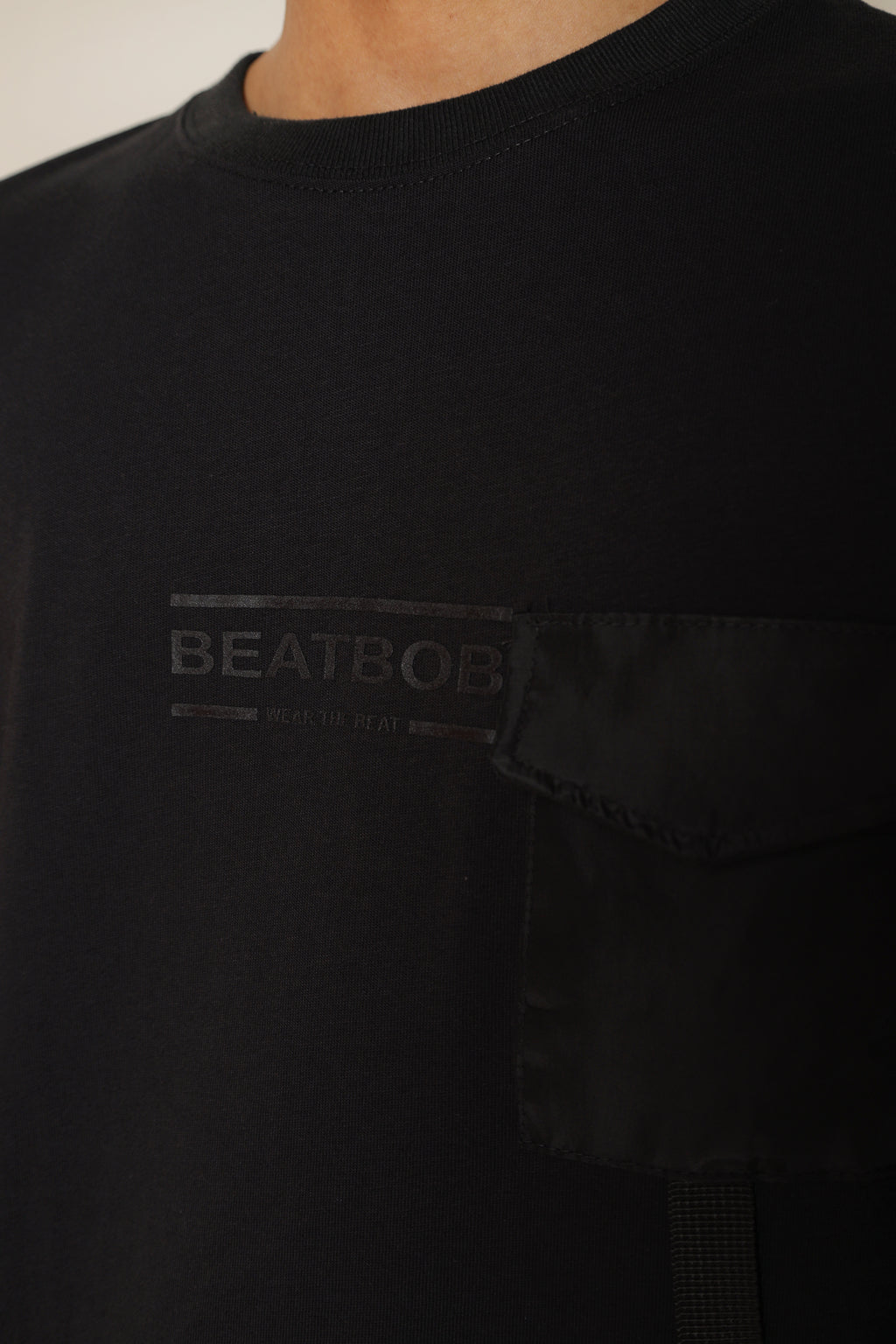 The standout feature lies in its functional belt strap and pocket detailing, giving the shirt a tactical edge while keeping it practical and fashion-forward. Styled in solid black with Beatbob’s minimal branding, it’s a piece that effortlessly bridges street and utility fashion.