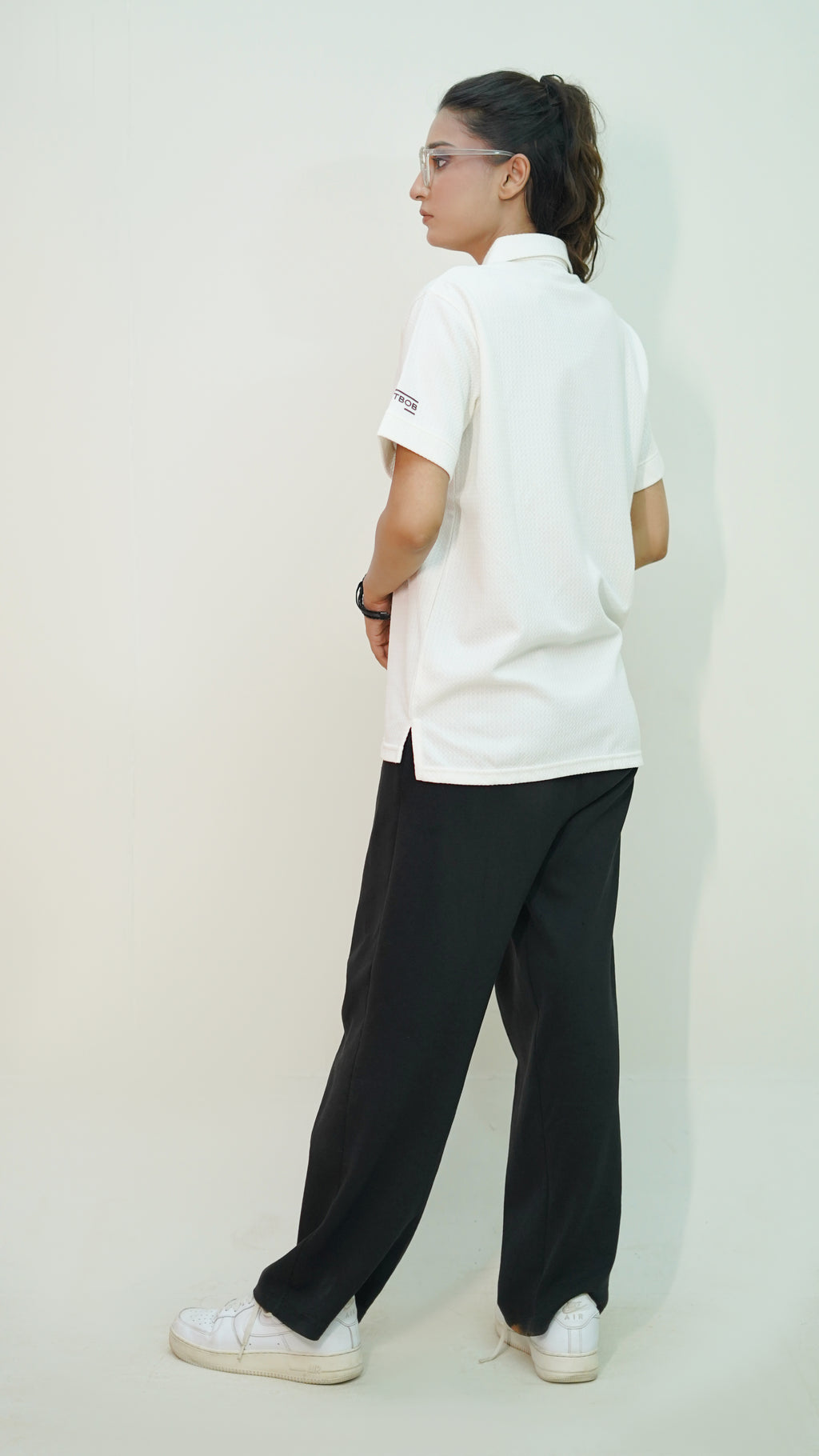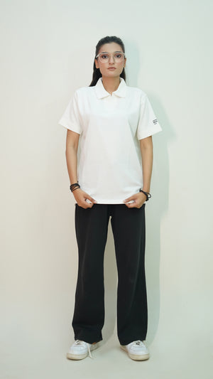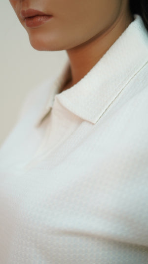The white base accented with green and brown panels reflects grounded, earthy aesthetics, while the polo collar design adds a touch of classic refinement. Versatile enough for casual days or smart-casual styling, this piece blends modern streetwear with timeless polo elegance.
