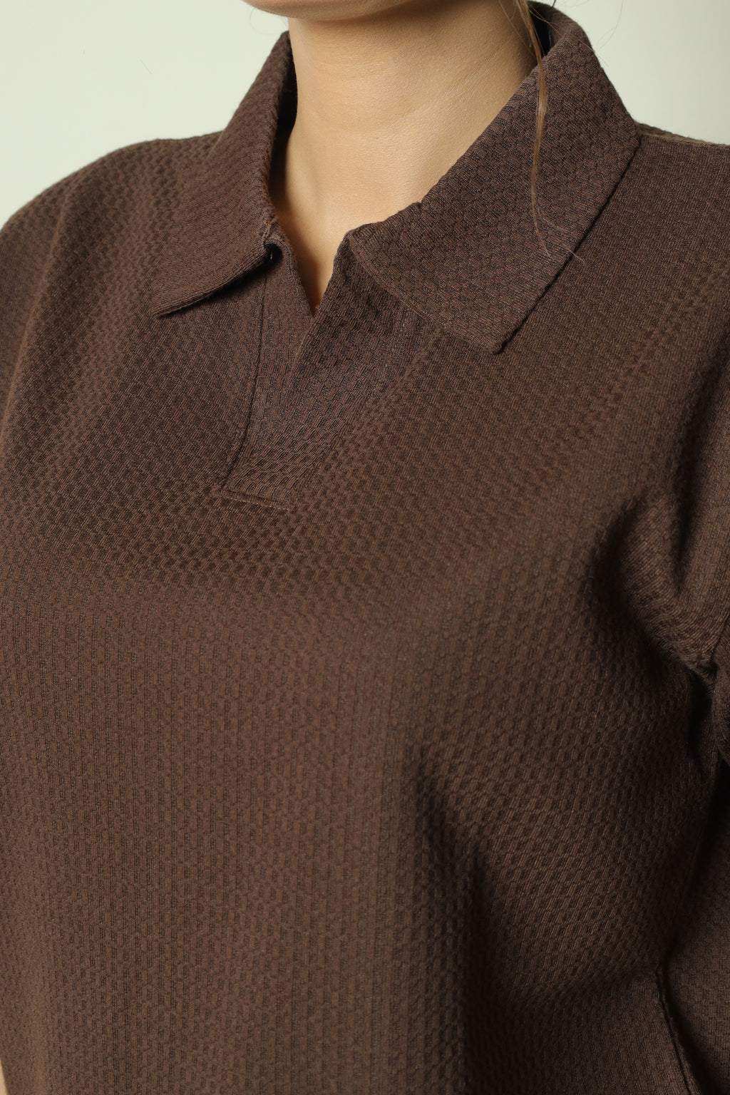 - Design: Polo collar with multi-tone earthy palette